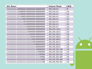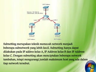 Dokumen tersebut membahas konsep subnetting yang digunakan untuk memecah jaringan menjadi subnetwork lebih kecil untuk meningkatkan efisiensi dan mengurangi kemacetan lalu lintas jaringan. Subnetting dapat dilakukan pada kelas alamat IP A, B, dan C dengan menggunakan subnet mask untuk menentukan mana subnet, host, dan broadcast addressnya.