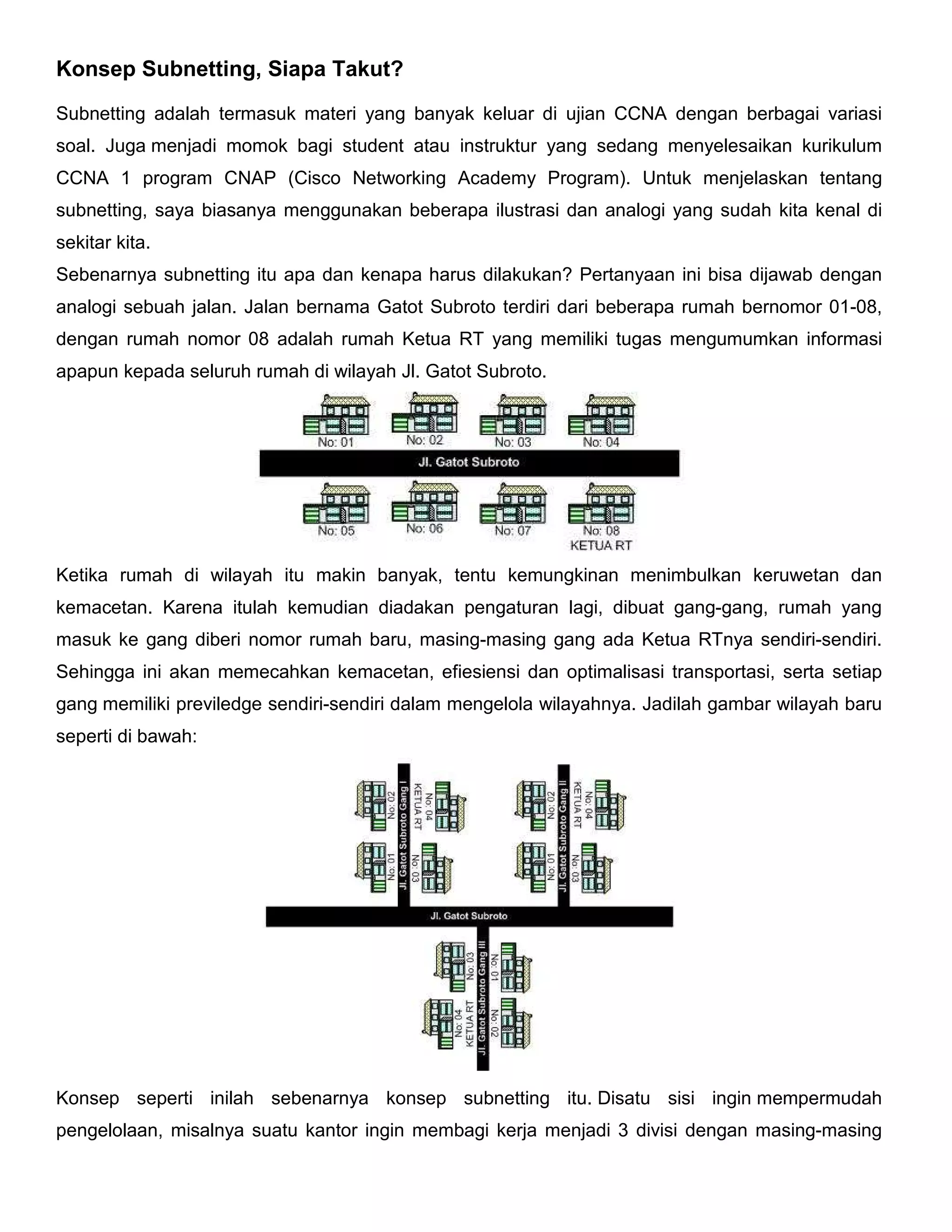 Konsep Subnetting adalah membagi jaringan besar menjadi subnet-subnet kecil untuk meningkatkan efisiensi dan mengelola lalu lintas jaringan. Subnetting melibatkan penentuan subnet mask, jumlah subnet dan host, serta alokasi alamat IP untuk setiap subnet dan host. Teknik penghitungan subnetting diterapkan untuk kelas jaringan A, B, dan C dengan mempertimbangkan oktet mana yang digunakan untuk pembagian subnet.