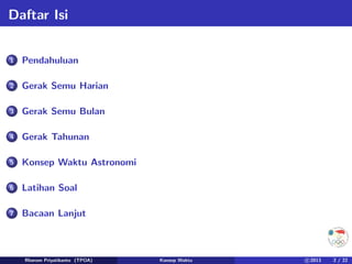 Dokumen ini menjelaskan konsep waktu dalam astronomi, mencakup gerak semu harian dan tahunan, serta fase bulan. Penulis juga membahas tentang waktu terbit dan terbenam objek langit, serta teori dan rumus yang terkait dengan pergerakan benda langit. Selain itu, terdapat latihan soal dan referensi untuk bacaan lebih lanjut.