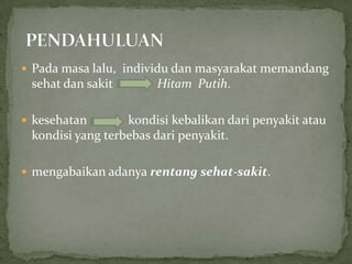 Berdasarkan dokumen tersebut, konsep sehat dan sakit dipandang secara lebih luas dari sekadar kehadiran atau ketidakhadiran penyakit. Sehat meliputi aspek psikososial seperti rasa memiliki kekuasaan dan hubungan sosial. Sakit didefinisikan sebagai gangguan fungsi fisik, mental, sosial, dan psikologis. Terdapat berbagai model yang menjelaskan hubungan antara agen, pejamu, lingkungan