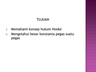 Dokumen ini membahas konsep hukum Hooke yang menyatakan bahwa gaya elastis berbanding lurus dengan pertambahan panjang benda. Diperkenalkan rumus untuk menghitung konstanta pegas dan langkah-langkah eksperimen untuk menentukan nilai tersebut. Selain itu, terdapat penjelasan mengenai elastisitas benda dan pertanyaan pendahuluan terkait topik ini.