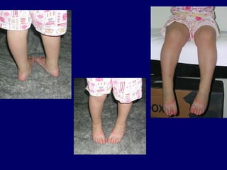 #21 Knock knees/ bandy legs Physiologic-3-8 years symmetrical, distance between ankles<10cms on standing Pathological-asymmetrical, gets worse with age –causes trauma, rickets, skeletal dysplasias congenital limb deficiencies