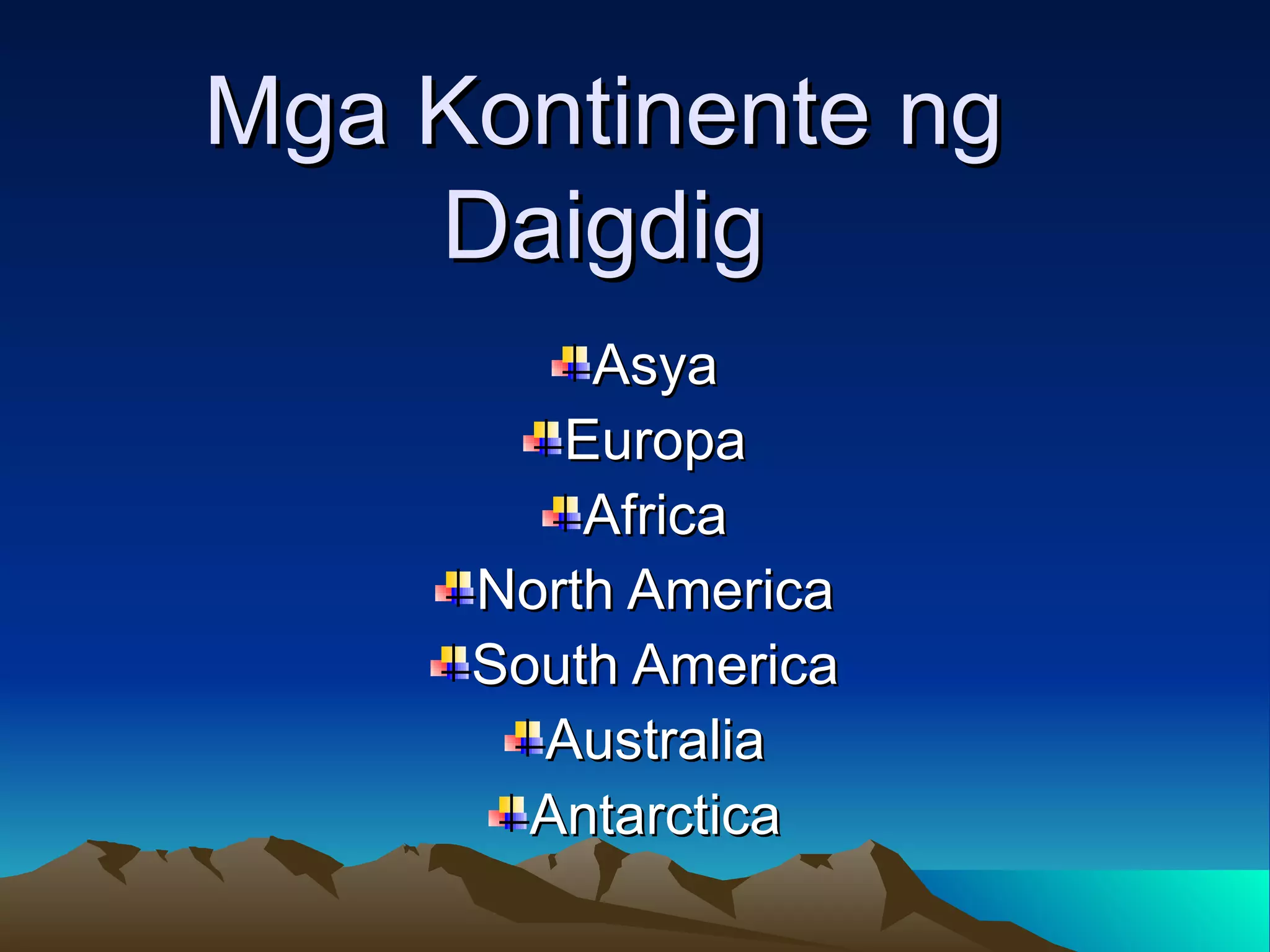 Ang mundo ay binubuo ng pitong kontinente: Asya, Europa, Africa, North America, South America, Australia, at Antarctica. Ang bawat kontinente ay may kanya-kanyang mga katangian, tulad ng laki, populasyon, at mga natatanging heograpikal na feature, kabilang ang pinakamalaking bundok at ilog. Ang Antarctica ang tanging kontinente na natatakpan ng yelo at walang permanenteng populasyon maliban sa mga siyentista.