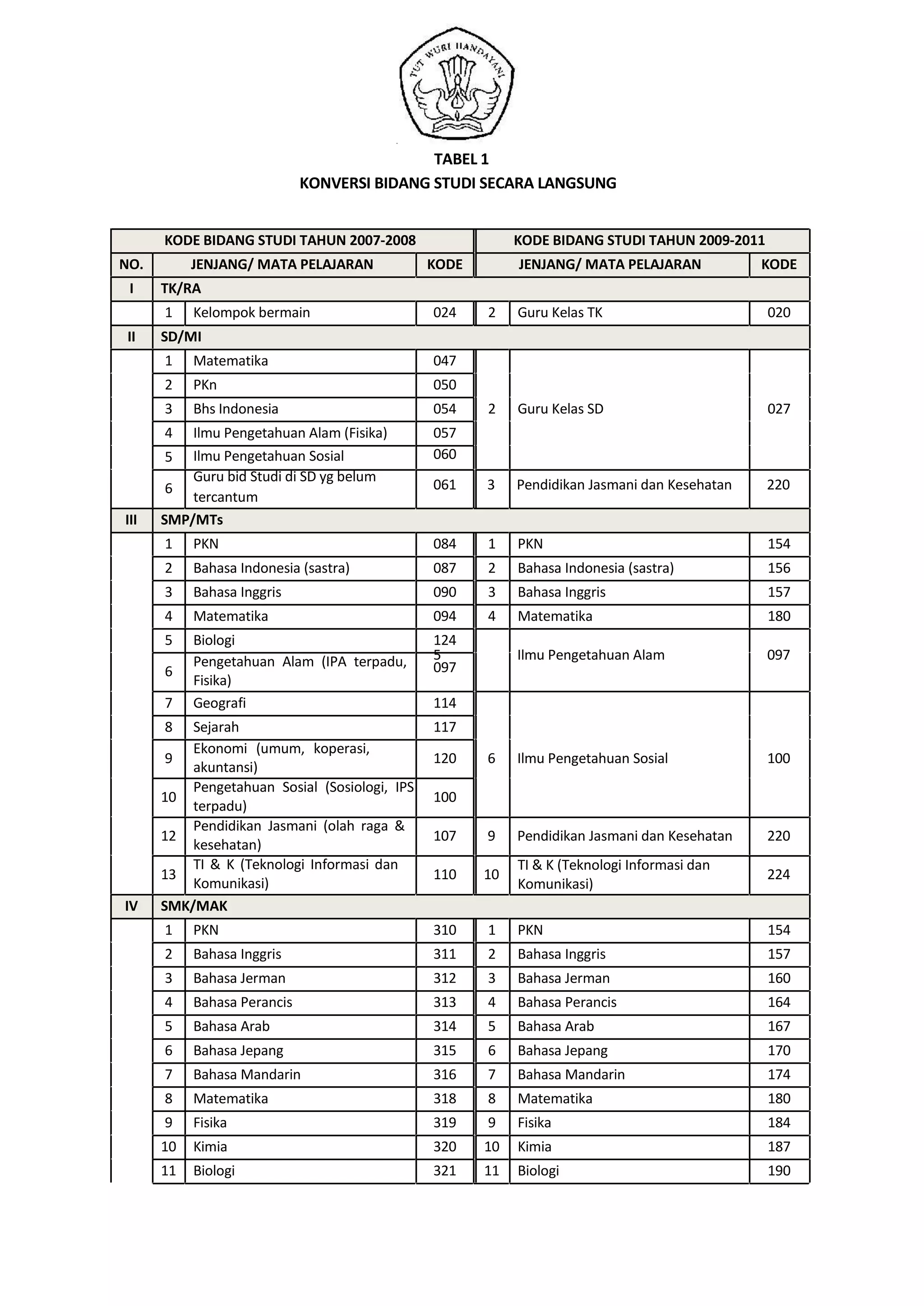 Dokumen ini menyajikan tabel konversi kode bidang studi untuk berbagai jenjang pendidikan dari tahun 2007-2008 hingga 2009-2011. Terdapat rincian mengenai kode jenjang dan mata pelajaran yang mencakup berbagai disiplin ilmu. Informasi ini bertujuan untuk memudahkan identifikasi dan perbandingan kurikulum pendidikan di Indonesia.