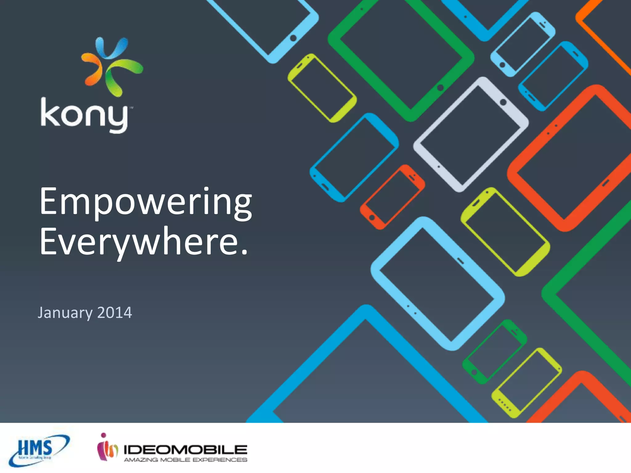 This document provides an overview of Kony, a mobile application development platform, and its partners HMS and Ideomobile. Kony addresses the challenge of developing applications across multiple channels by offering a single code base that can build applications for mobile, web, tablets, and desktop from a single code. The Kony platform provides tools for visual design, development, integration, testing and deployment that allow applications to be created once and run on any device. It also ensures applications are future proofed by supporting updates to operating systems and new devices.