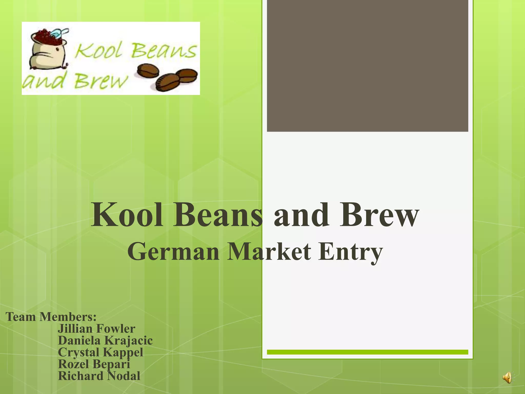 Kool Beans and Brew plans to enter the German market by opening a café in Berlin. The team analyzed Germany's demographics, economy, coffee market competiton and trends, and consumer preferences. They developed a differentiation strategy focused on specialty coffee, healthy food options, and technology. Kool Beans and Brew aims to attract young professionals by providing a relaxing social space with WiFi, music, and community in Kreuzberg, Berlin.