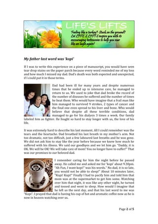 My father passed away peacefully in my mother's arms, with his last words being "Kopi", his favorite drink. Though his death was expected due to numerous illnesses he had fought for years, it was still difficult to say goodbye. At his funeral, our family honored him by dressing and preparing his body, sharing stories of how he was a loving husband and father who taught us integrity and charity. We take comfort knowing he is now in heaven without pain, looking over us and enjoying kopi with Jesus. I miss him deeply and find comfort knowing he fought so hard to stay with us and will continue watching over our family.