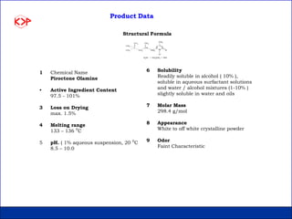This document summarizes product data and properties of Kopirox, an antidandruff active ingredient from Kumar Organic Products. Kopirox is a white to off-white crystalline powder with a molecular mass of 298.4 g/mol that is soluble in alcohol and aqueous surfactant solutions. It is an effective antidandruff agent that can be used between 0.1-1.0% in formulations. Toxicology studies found Kopirox to have low acute oral and dermal toxicity. Skin compatibility tests showed it causes only slight irritation at low concentrations and is compatible with most cosmetic ingredients.