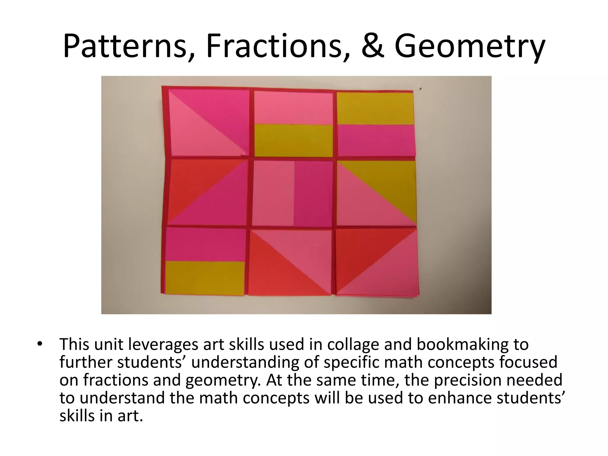 This document outlines an art and math integrated curriculum unit focusing on patterns, fractions, and geometry. The unit uses art skills like collage, bookmaking, and origami to help students better understand math concepts. Lessons include creating paper quilts to learn fractions, origami books to show equivalent fractions, and sculptures applying concepts covered. Formative assessments include visual thinking discussions of student work. The teachers reflected on how hands-on learning and collaboration between arts and math teachers can improve student understanding and curriculum design.
