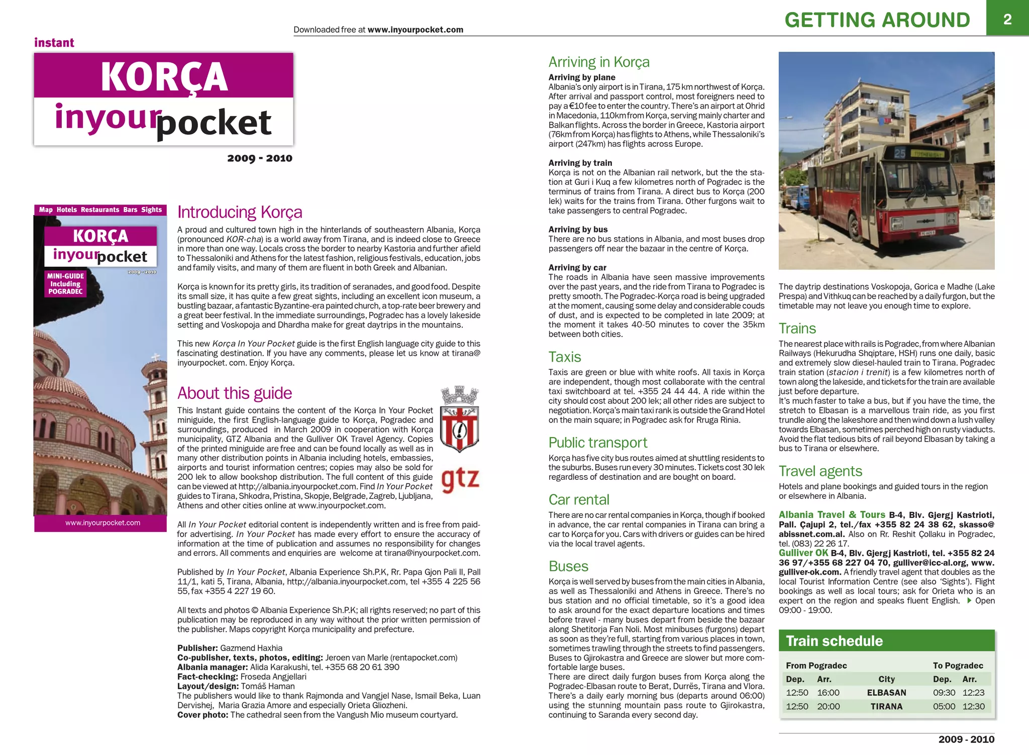 This document provides information about transportation options for arriving in and traveling around the city of Korça, Albania. It details that the closest major airport is in Tirana, 175km away, and there are also smaller airports in Ohrid, Macedonia and Kastoria, Greece. Korça can be reached by train from Tirana by transferring in Pogradec, or directly by bus. Within Korça, taxis and local buses provide transportation, while day trips to nearby destinations can be taken by furgon or bus. Basic train service also operates between Pogradec and Tirana.