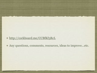 This document discusses using technology in 21st century classrooms and provides examples. It notes that today's students are highly connected to technology and playful learners. It argues that technology allows learning without ceilings by providing abundant information. Examples are given of using tools like iMovie, Comic Life, Glogster, podcasts, Skype, and Edmodo to enhance language learning, writing, and speaking skills. Students are encouraged to provide feedback on integrating technology via a corkboard discussion.