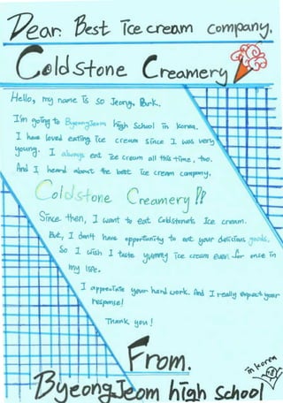 The document is a letter written by a student named Sojung Yoon from Bjeonjeom High School in Korea, who loves Cold Stone Creamery's ice cream. The student thinks Cold Stone's ice cream is very delicious and sweet, and enjoys eating it very much. The student requests a coupon for Cold Stone ice cream.