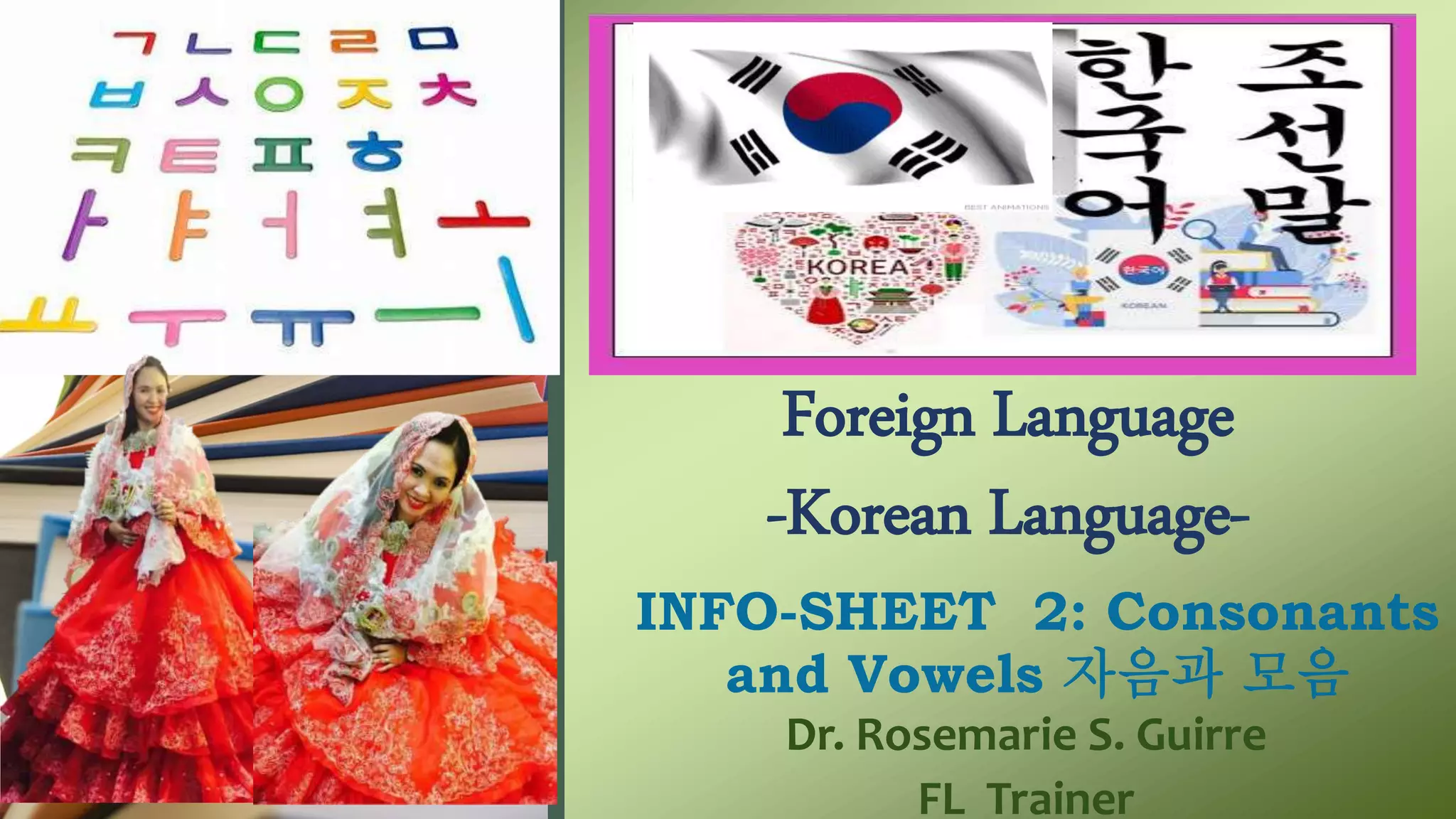 The document is an information sheet about Korean consonants and vowels prepared by Dr. Rosemarie S. Guirre. It discusses the Korean writing systems of Hangul, Hanja, and Muntcha. It provides examples of Korean consonants and vowels, noting that spaces can occur at the beginning, middle, or end of syllables. The sheet includes tasks for practicing speaking the Korean alphabet.
