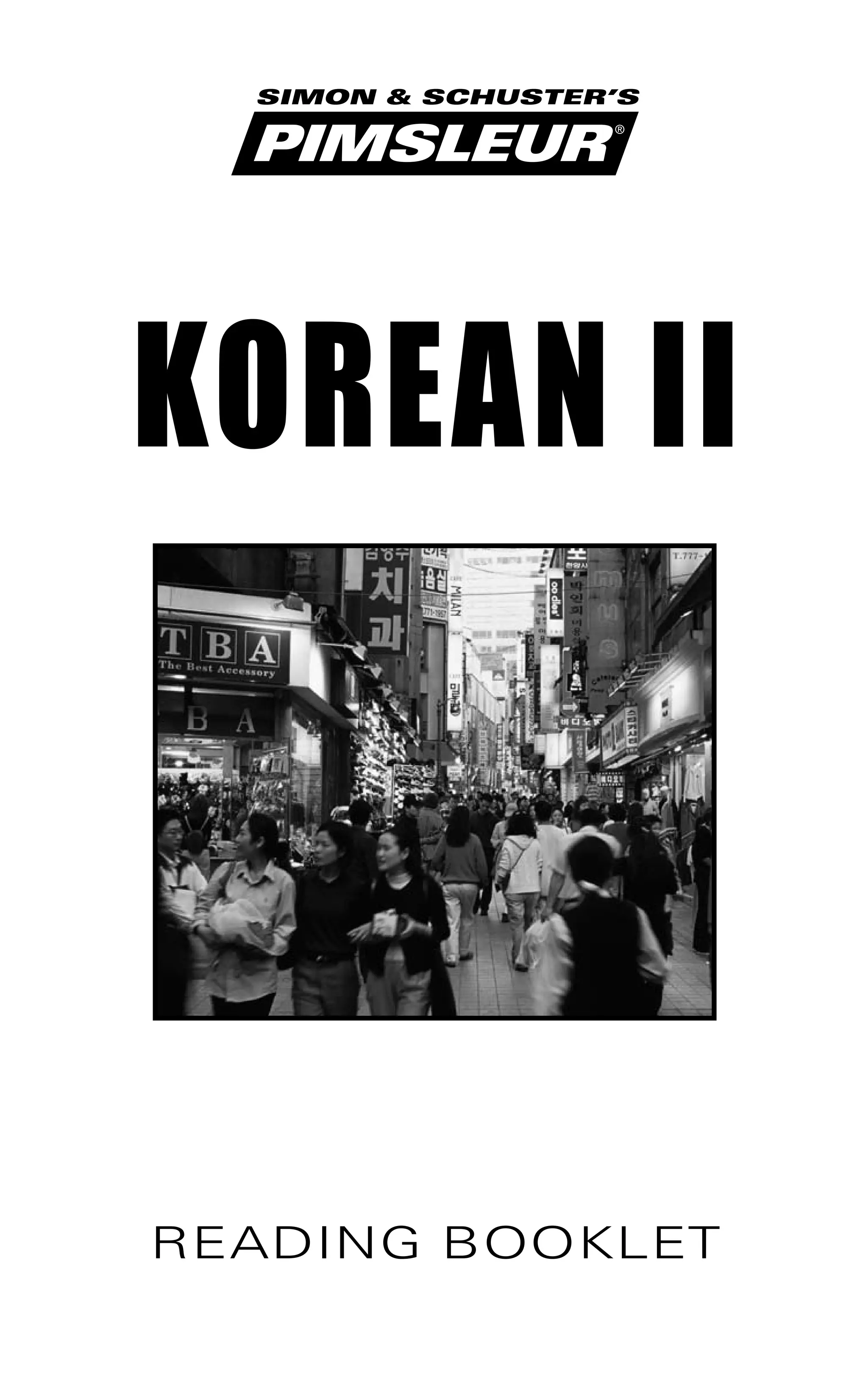 This document is a reading booklet for Korean II from Pimsleur. It contains 18 reading lessons with vocabulary words and sentences. It introduces the Korean alphabet of consonants, vowels, and syllables. It explains the basic rules for combining letters into syllabic blocks to form words. The lessons provide practice reading words and sentences using the Korean alphabet.