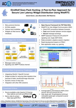 The document presents a peer-to-peer approach for secure low latency widget distribution using WebRTC, developed by Prof. Dr. M. Jarke and team, showcased at the 14th International Conference on Web Engineering. Key contributions include a 600% reduction in average latency and the integration of adaptive session migration and OAuth2. The open-source framework aims to address web engineering challenges by enabling direct browser-to-browser connections for faster event transfer.