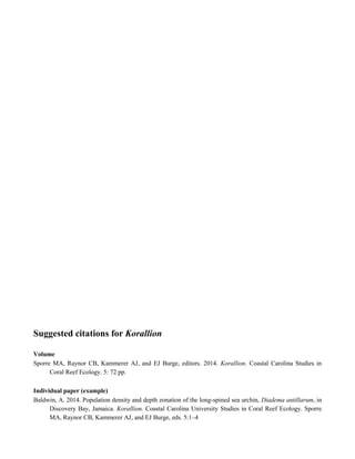 This study examined the population density and depth distribution of the long-spined sea urchin Diadema antillarum in Discovery Bay, Jamaica. D. antillarum is a keystone species that regulates algal growth on coral reefs through grazing. The study found that D. antillarum densities were highest between 5-15 meters deep, defining the "Diadema zone." Compared to 2010, D. antillarum populations have increased in 2014 and the depth range of highest densities has become slightly shallower. The recovery of D. antillarum is important for the health of Caribbean coral reefs by limiting competition between algae and corals for space and light.