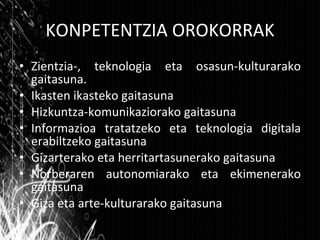 KONPETENTZIA OROKORRAK Zientzia-,teknologia eta osasun-kulturarako gaitasuna. Ikasten ikasteko gaitasuna Hizkuntza-komunikaziorako gaitasuna Informazioa tratatzeko eta teknologia digitala erabiltzeko gaitasuna Gizarterako eta herritartasunerako gaitasuna Norberaren autonomiarako eta ekimenerako gaitasuna Giza eta arte-kulturarako gaitasuna