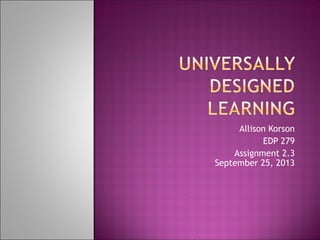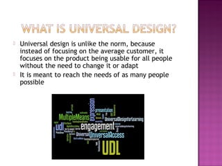 The document discusses Universal Design for Learning (UDL), which focuses on making learning accessible to all people by providing multiple means of representation, expression, and engagement. UDL is based on principles from cognitive neuroscience and aims to support learners with different strengths and needs. There are three main sections to UDL: representation, expression, and engagement, which each have guidelines to provide options for perception, physical action, language/symbols, and recruiting/sustaining student interest. The goal is for every student to feel like an expert learner through flexible options that allow for individual learning paths.