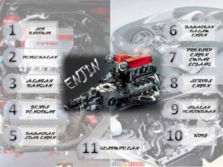 This document discusses the main components and principles of an engine, including the introduction, four-stroke principle, external parts, and servicing tools. It also covers engine mounts, types of belts, and includes a quiz and conclusion section.