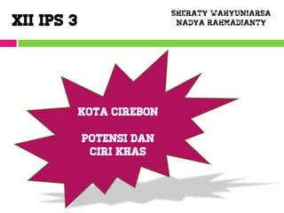 Kota Cirebon memiliki potensi ekonomi dan budaya yang kuat. Ekonominya didominasi oleh industri pengolahan, perdagangan, dan pariwisata sejarah seperti Keraton Kasepuhan, Kanoman, dan Mesjid Agung Sang Cipta Rasa, serta kerajinan batik dan udang rebon tradisional. Kota ini memiliki sumber daya alam dan strategis secara geografis.