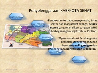 Dokumen ini membahas konsep kabupaten/kota sehat yang diimplementasikan melalui pendekatan lintas sektor untuk meningkatkan kesehatan masyarakat di Indonesia. Berbagai indikator kesehatan dan pencapaian status kesehatan masyarakat dijelaskan, serta pentingnya kerjasama antara pemerintah dan masyarakat dalam pencapaian tersebut. Selain itu, terdapat informasi mengenai penghargaan kabupaten/kota sehat dan pengembangan program kesehatan di berbagai daerah.