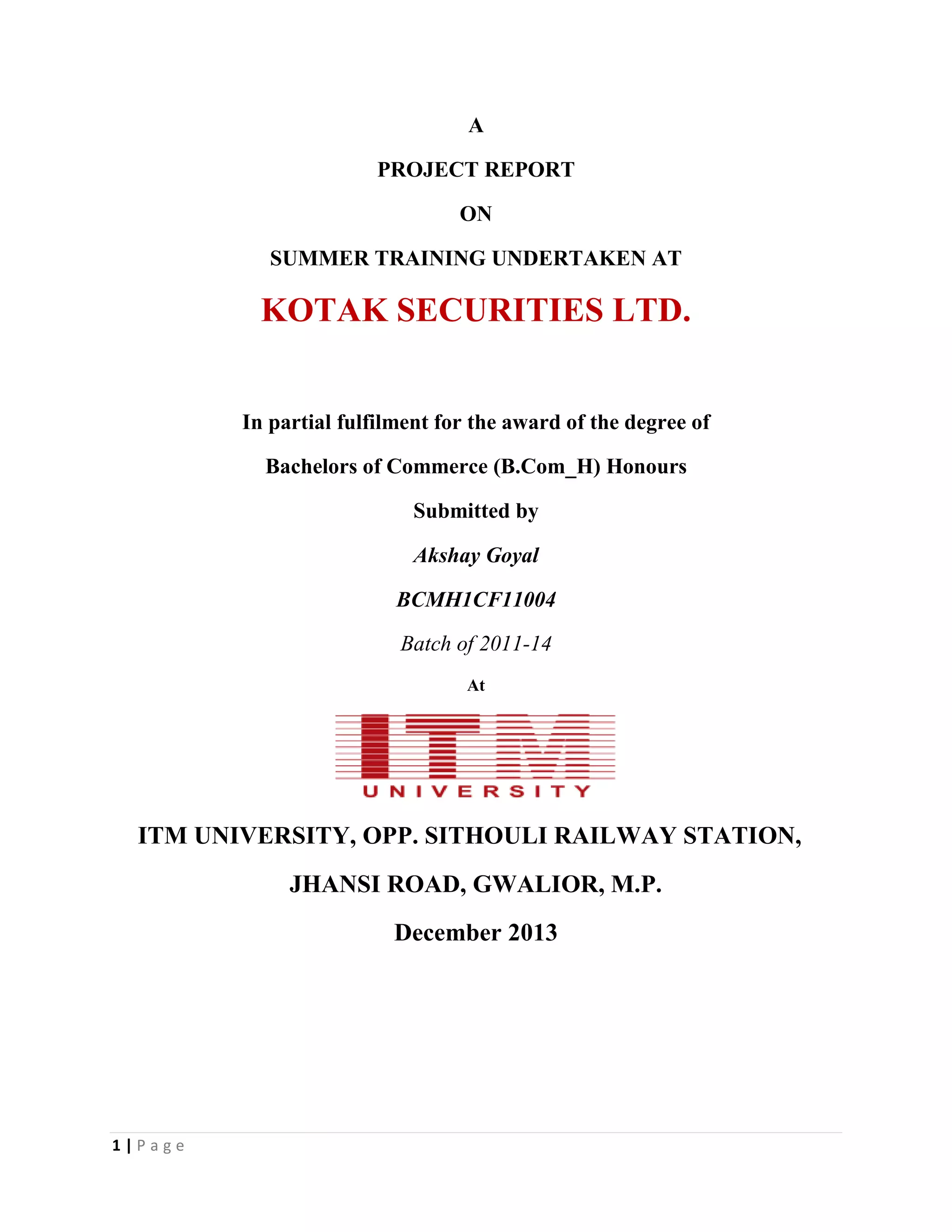 The document provides information about Kotak Securities Ltd, a subsidiary of Kotak Mahindra Bank. It was originally established in 1994 and has over 7.4 lakh customers. Kotak Securities has a wide network across India and international offices. It processes over 400,000 trades per day. The company provides stock broking services through branches and internet, as well as distribution of financial products. Kotak Securities has research expertise in fundamental and technical analysis backed by a team of analysts. It also offers portfolio management services.