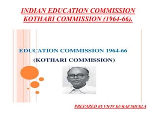 The Kothari Commission (1964-66), chaired by Daulat Singh Kothari, was the first major commission in India aimed at modernizing and standardizing education to meet national goals. Its recommendations focused on curricular improvement, equal educational opportunities, productivity enhancement, and social integration through various educational reforms. While praised for its comprehensive approach to educational issues, it faced criticisms for its unresolved administrative roles and conflicting views on instructional mediums.