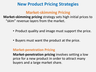 This document summarizes different pricing strategies and considerations discussed in Chapter 11 of the textbook "Principles of Marketing" by Kotler and Armstrong. It outlines new product pricing strategies like market-skimming and market-penetration pricing. It also discusses product mix pricing strategies, price adjustment strategies, factors that influence price changes, and public policy considerations related to pricing.