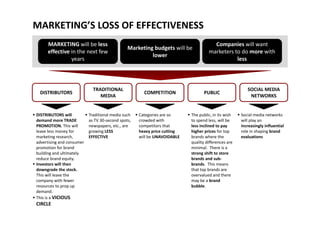 1. Marketing will become less effective in the coming years as budgets are reduced and companies demand more with less. Traditional media is also growing less effective as competition increases.