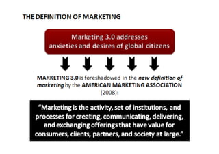 3. Marketing must reinvent itself to address new realities like social media influence, empowered customers, and globalization. Marketing 1.0 was product-focused while Marketing 2.0 was customer-oriented; Marketing 3.0 will be value-driven and focus on collaboration.