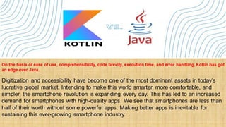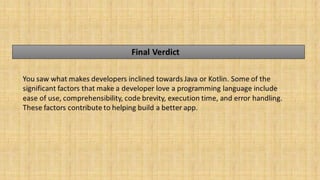 On the basis of ease of use, comprehensibility, code brevity, execution time, and error handling, Kotlin has got an edge over Java.