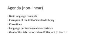 The document outlines the features and advantages of Kotlin, a programming language introduced by JetBrains in 2011 as a better alternative to Java, emphasizing its compatibility with Java, succinct syntax, and support for modern programming paradigms. It covers basic language concepts, coroutine support, and the Kotlin collections API, while providing examples demonstrating Kotlin's expressive capabilities and type safety features. The document serves as an introduction for Java developers looking to transition to Kotlin, highlighting its ease of use and strong community backing.