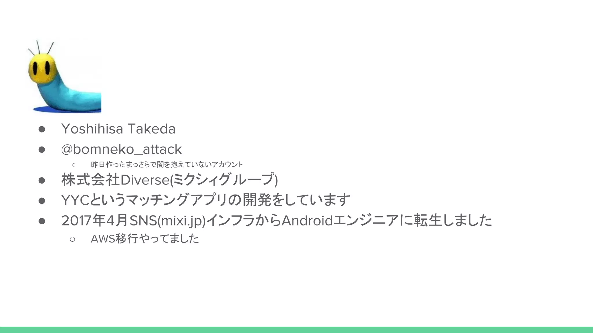 @bomneko_attack ○ 昨日作ったまっさらで闇を抱えていないアカウント ● 株式会社Diverse(ミクシィグループ) ● YYCというマッチングアプリの開発をしています ● 2017年4月SNS(mixi.jp)インフラからAndroidエンジニアに転生しました ○ AWS移行やってました