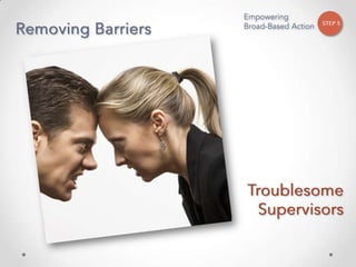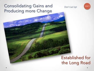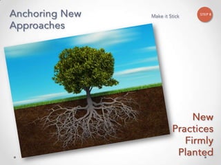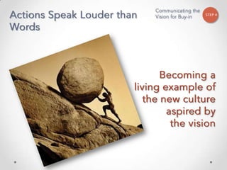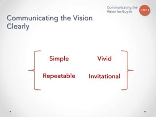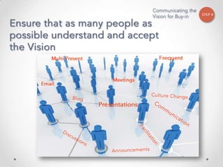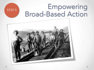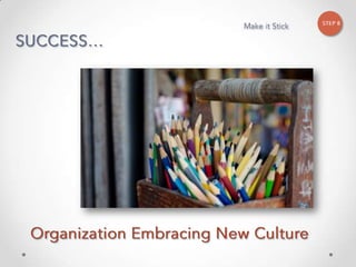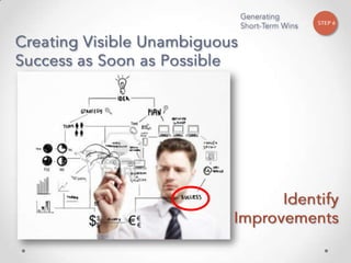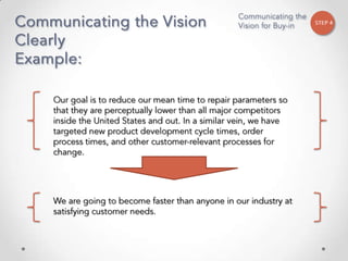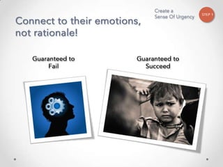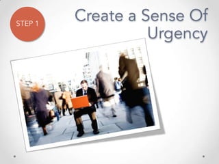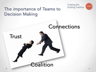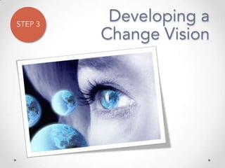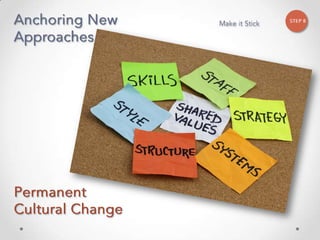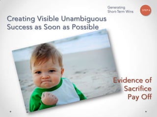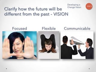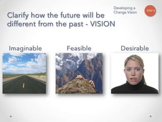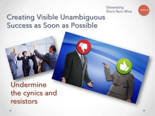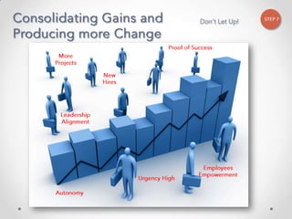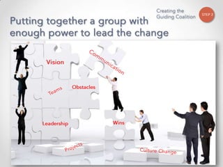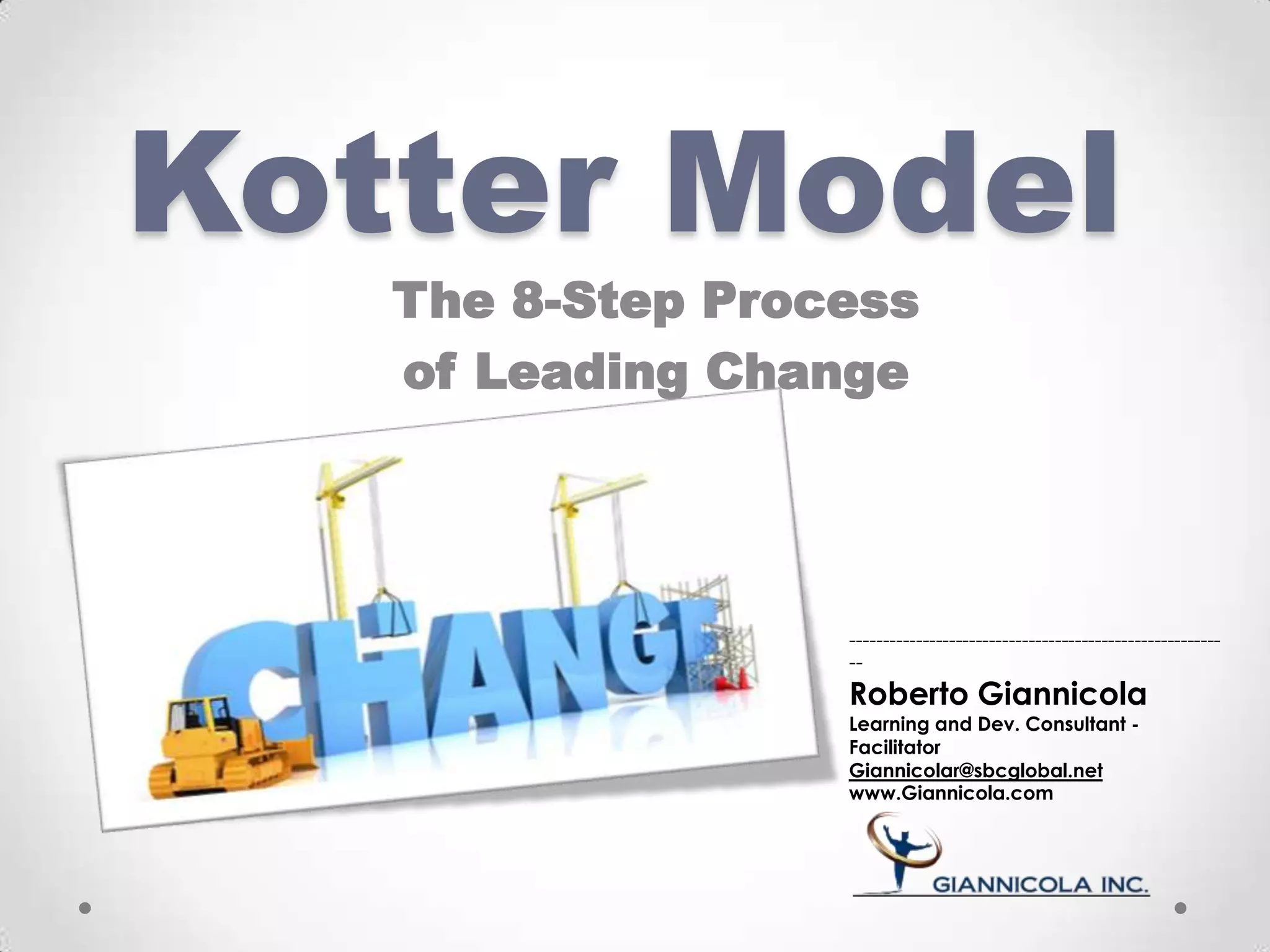 The document outlines John Kotter's 8-step process for leading organizational change, which includes establishing a sense of urgency, forming a powerful coalition, creating a vision for change, communicating the vision, empowering others to act on the vision, planning for and creating short-term wins, consolidating improvements and producing still more change, and institutionalizing new approaches. The document provides contact information for a learning and development consultant who facilitates the Kotter change model.