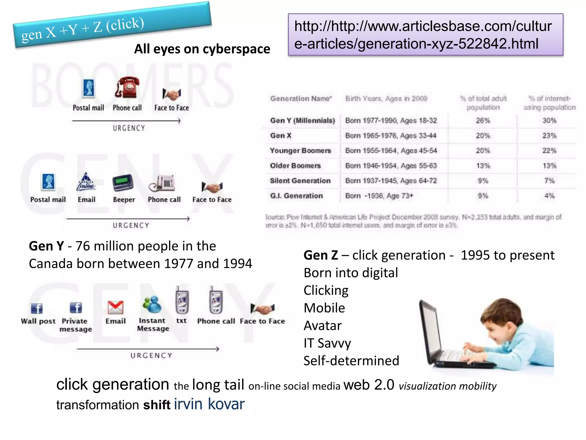 The document discusses the characteristics and impact of Generation Y and Generation Z, emphasizing their digital nativity and reliance on technology for communication and socializing. It covers the shift towards online education and collaboration, highlighting the importance of web 2.0 tools and social media in shaping the learning experience. Additionally, it raises questions about academic integrity and the evolving landscape of education amidst increasing digital accessibility.