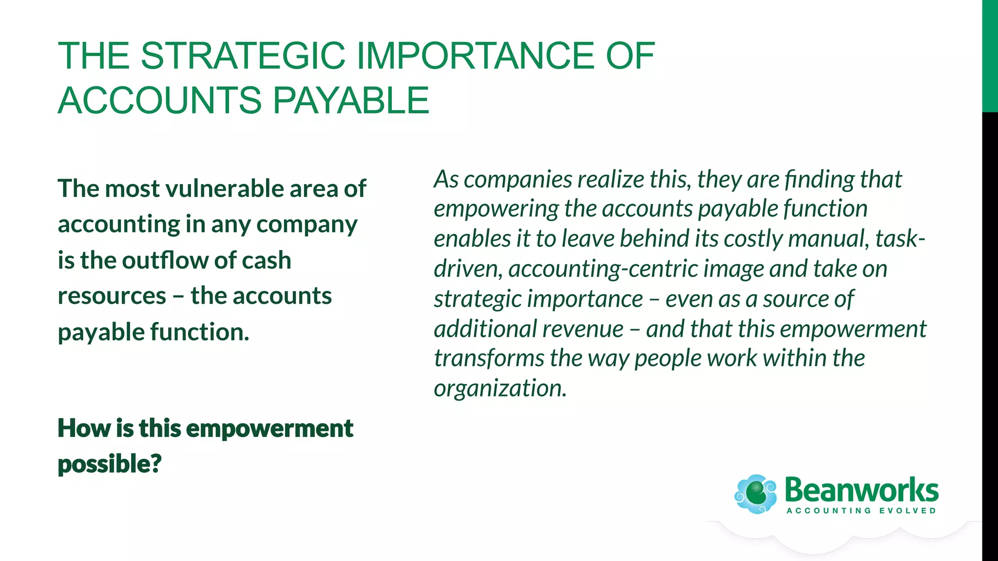 The document discusses the strategic importance of accounts payable (AP) automation, detailing five key performance indicators (KPIs) that organizations should measure to improve efficiency, including cost per invoice, processing speed, productivity per team member, variance analysis, and purchase order matching speed. It emphasizes that empowering the AP function with technology can significantly reduce costs and enhance productivity, positioning AP as a strategic asset rather than a cost center. Additionally, it suggests that organizations adopting AP automation can achieve best-in-class results and provides considerations for selecting automation solutions.
