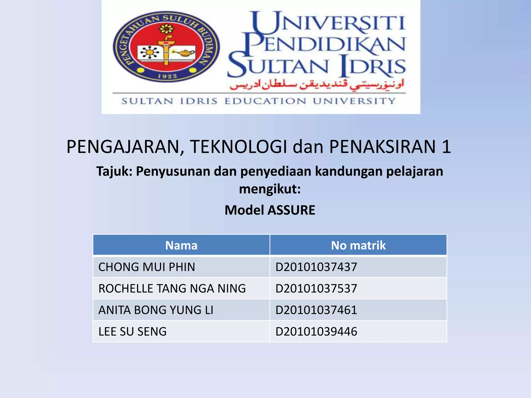 Dokumen ini membahas tentang penyusunan dan penyediaan kandungan pelajaran menggunakan model ASSURE, termasuk analisis pelajar, penyataan objektif, pemilihan kaedah dan media, serta penglibatan pelajar dalam proses pembelajaran. Ia menekankan pentingnya pemilihan media yang sesuai dan pengalaman pembelajaran aktif untuk meningkatkan keberkesanan pengajaran. Penilaian dan revisi juga diperlukan untuk memastikan objektif pengajaran tercapai.