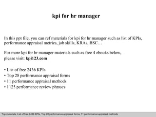 This document discusses key performance indicators (KPIs) for HR managers. It provides information on developing KPIs, including identifying operational objectives, key result areas, tasks, and methods for measuring results. The document also discusses common mistakes in creating KPIs, such as having too many KPIs and not tailoring KPIs to different stages. Additionally, it describes different types of KPIs, such as process, input, output, leading, lagging, outcome, qualitative, and quantitative KPIs. The document aims to provide guidance and resources for developing effective KPI systems.