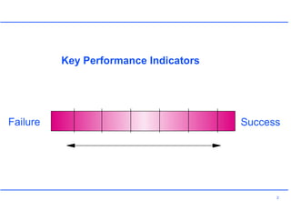 This document discusses key performance indicators (KPIs) and how to establish them for projects and processes. It defines KPIs and critical success factors. The objectives are to demonstrate how KPIs relate to projects, define some examples of KPIs, and show how to measure against them. It provides examples of using KPIs to measure costs, quality, time, service and processes. It emphasizes selecting KPIs linked to objectives, setting targets, developing measurement plans, monitoring performance, and providing feedback.