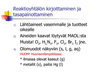 Reaktioyhtälön kirjoittaminen jatasapainottaminen Lähtöaineet vasemmalle ja tuotteet oikealle Aineiden kaavat löytyvät MAOL:sta Muista! O 2 , H 2, N 2 , F 2 , Cl 2 , Br 2 I 2 jne. Olomuodot näkyviin (s, l, g, aq) HUOM! Huoneenlämpötilassa * ilmassa olevat kaasut (g) * metallit (s), paitsi Hg (l)
