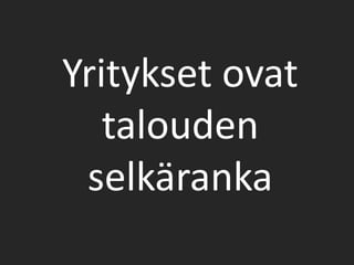 TuotannontekijätRaaka-aineetTyövoimaKiinteä pääoma (koneet,rakennukset jne.)Tietotaito, yrittäjyysYritys pyrkii yhdistämään eri tuotannontekijöitä mahdollisimman tehokkaastiTavoitteena saada mahdollisimman pienillä panostuksilla mahdollisimman suuri tuotto
