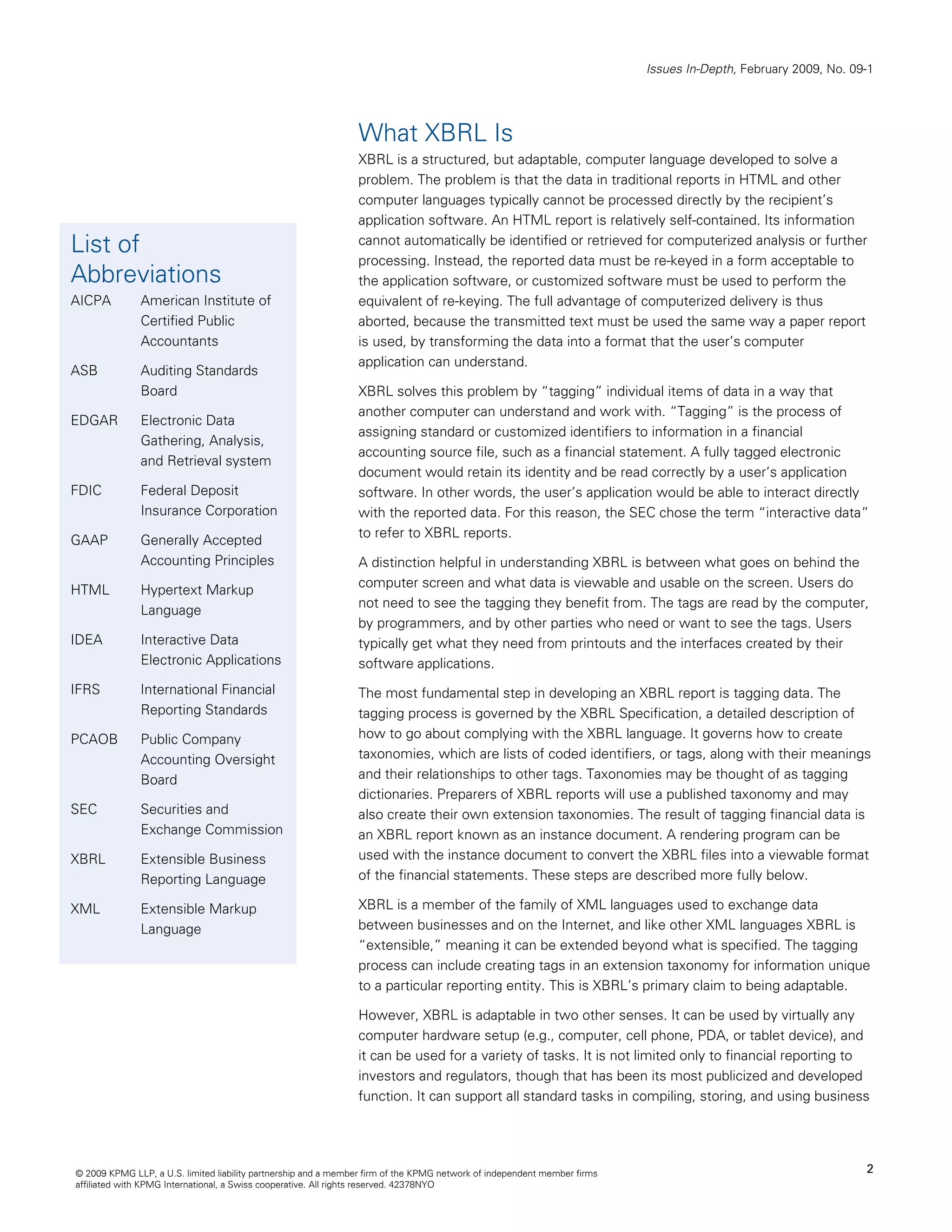 The document discusses the SEC's new requirement for public companies to submit financial statements and other reports in XBRL format. It provides an overview of what XBRL is, how it works by tagging financial data using standardized elements defined in taxonomies, and the benefits it provides by making financial data easily readable by computers. The SEC rule requires affected public companies to submit XBRL-formatted financial statements and other information as exhibits to certain filings, and to post this information on their websites. The requirements will be phased in over three years beginning in 2009.