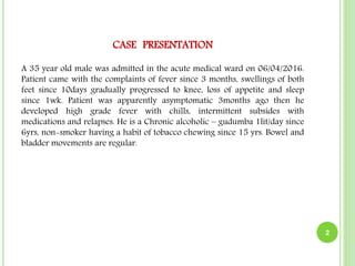 This case presentation summarizes the hospital admission of a 35-year-old male diagnosed with Grade II alcoholic liver disease and hepatic encephalopathy. He presented with fever, swelling of the feet and knees, loss of appetite, and sleep issues. His medical history revealed chronic alcohol use and tobacco chewing. On examination, he exhibited pallor, edema, and jaundice. Laboratory tests showed elevated liver enzymes. He was diagnosed with Grade II alcoholic liver disease and hepatic encephalopathy based on his symptoms, risk factors, and diagnostic tests. He was treated medically and counseled on lifestyle modifications and medication adherence.