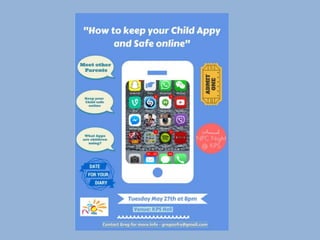 This document provides information on children's use of technology and social media as well as safety tips for parents. It notes that while parents educate children about safety offline, many do not provide the same level of guidance for online activities. Statistics show high rates of internet and social media use among children as young as 5, including risks like cyberbullying. It then lists the minimum age limits for popular social media platforms and apps. The remainder of the document offers specific safety tips for Snapchat, including how to block users, understand limitations of content deletion, and how to report abusive messages. It concludes by providing additional online parent resources and recommends discussing technology use and safety with children.