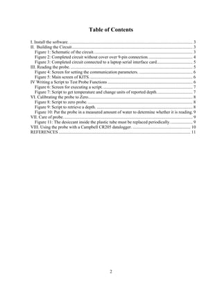 This document serves as a guide for using the KPSI transducer probe model 500, detailing software installation, circuit construction, probe reading, and script writing for probe function testing. It also includes calibration instructions, care guidelines for the probe, and a reference to using the probe with a Campbell CR205 datalogger. Key instructions are provided with accompanying figures for clarity and troubleshooting advice.
