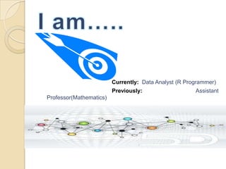 This document contains a summary of a candidate's education, work experience, skills, and responsibilities in previous roles. The candidate holds an M.S. in Mathematics and Scientific Computing and has worked as a Data Analyst using R and as an Assistant Professor of Mathematics. Their experience includes web analytics projects using R packages, data analysis, and creating algorithms and graphical representations of data. They also have teaching experience and skills in mathematics, statistics, software like Matlab and databases.