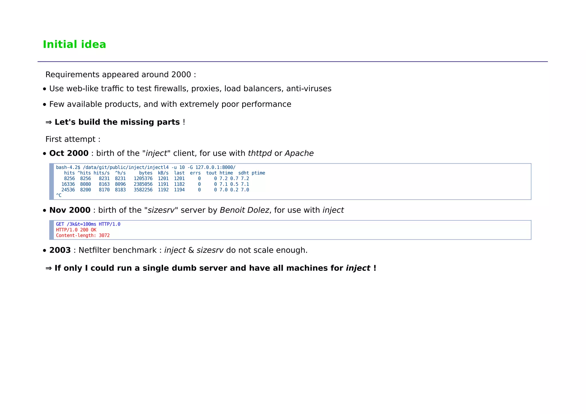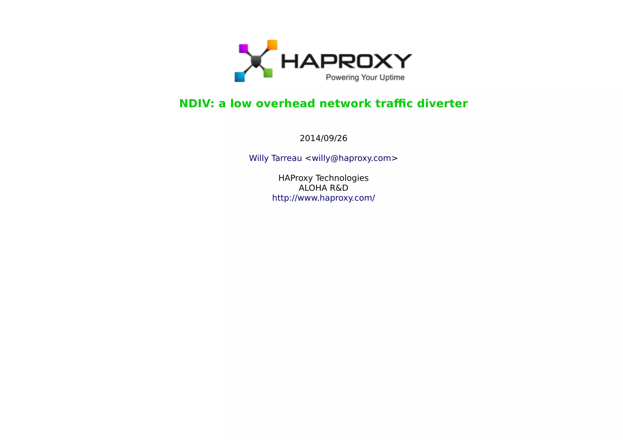 The document discusses the development of 'ndiv', a low overhead network traffic diverter aimed at improving performance for testing firewalls and servers. It outlines the history of related tools, design challenges, and the framework's implementation, which allows rapid packet processing with minimal overhead. Potential applications include network testing, packet capture, and traffic management, with further advancements expected in the future.