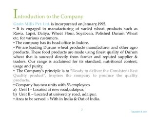 Grain Mills Pvt. Ltd. is a leading manufacturer of wheat products in India. The company was incorporated in 1995 and has its headquarters in Indore. It has two manufacturing units located in Udaipur with a total of 53 employees. The company produces a variety of wheat products including flour, semolina, and wheat bran. It sources wheat directly from farmers and traders to ensure quality. The document outlines the organizational structure of the company and provides details on the roles and responsibilities of key managers in different departments, including production, sales, finance, and human resources.
