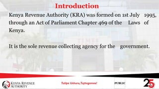 The Kenya Revenue Authority (KRA) was established in 1995 through an Act of Parliament to serve as the sole revenue collecting agency for the Kenyan government. Previously, various taxes were collected by separate departments within the Ministry of Finance, which led to high costs, duplication of roles, and difficulties with enforcement and audits. The KRA's mandate is to assess taxes, collect taxes, and account for all tax revenues. Its vision is to be a globally trusted revenue agency that facilitates tax and customs compliance.
