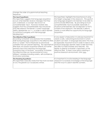 Krashen's theory of second language acquisition consists of six main hypotheses: the Acquisition-Learning hypothesis, the Monitor hypothesis, the Natural Order hypothesis, the Input hypothesis, the Affective Filter hypothesis, and the Reading Hypothesis. The document then provides explanations of how each hypothesis can apply to second language teaching, with a focus on creating opportunities for natural communication, balancing accuracy and fluency, teaching language in the order it is naturally acquired, providing comprehensible input, establishing a low-anxiety classroom environment, and incorporating reading.